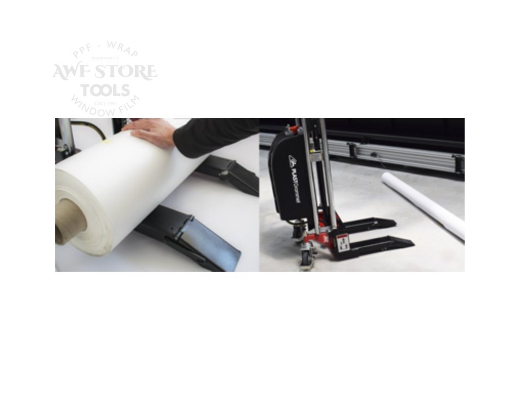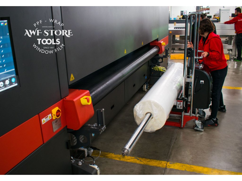 Tento model umožňuje obsluze bezpečně a samostatně nakládat těžké role médií do tiskáren či na dokončovací stoly bez rizika poranění zad. Stačí jednoduše nožním pedálem, napumpovat potřebný tlak a tím i výšku.